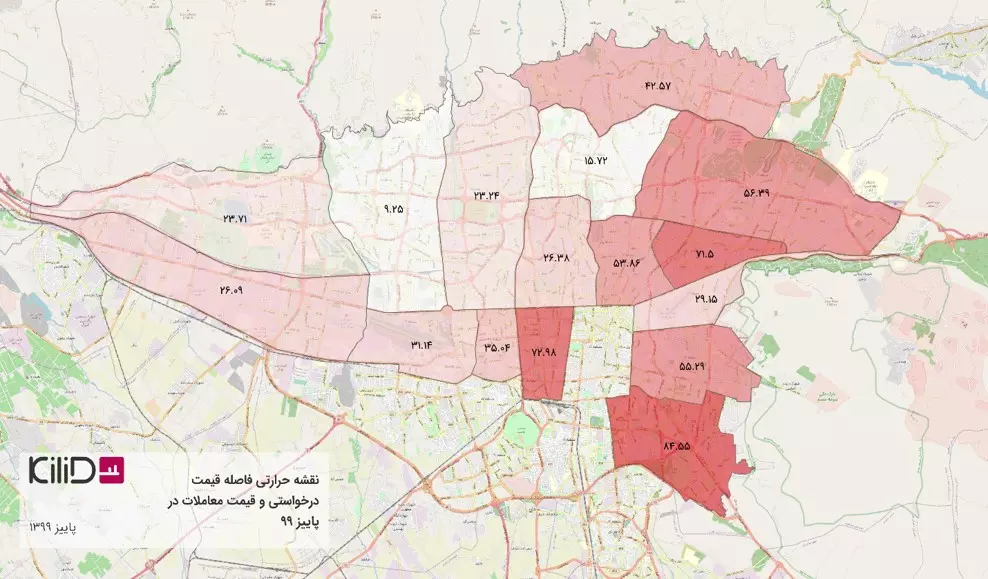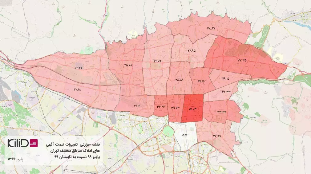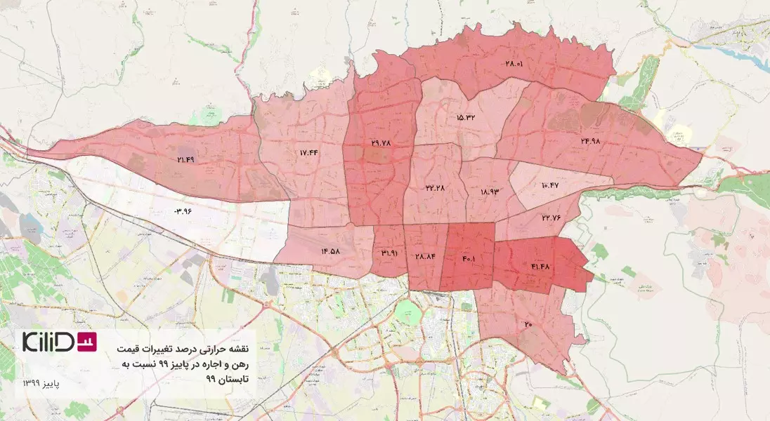 این افزایش قیمت در مناطق مختلف میزان متفاوتی داشته که خلاصه آن به شرح زیر است: در مقایسه پاییز نسبت به تابستان 99 بیشترین میزان افزایش قیمت مربوط به منطقه 12 تهران و به میزان 51 درصد و کمترین میزان افزایش قیمت مربوط به منطقه 16 و به میزان 5.1 درصد است. در نقشه حرارتی، این میزان برای مناطق مختلف شهر تهران مشخص گردیده است.